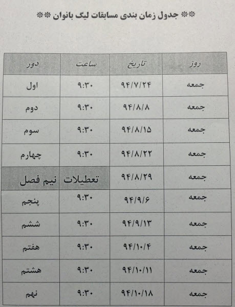 تبصره 2) چنانچه مسابقات در 7 دور برگزارشود پایان هفته سوم واگر در 9 دور برگزار شود پایان هفته چهارم نیم فصل خواهد بود.